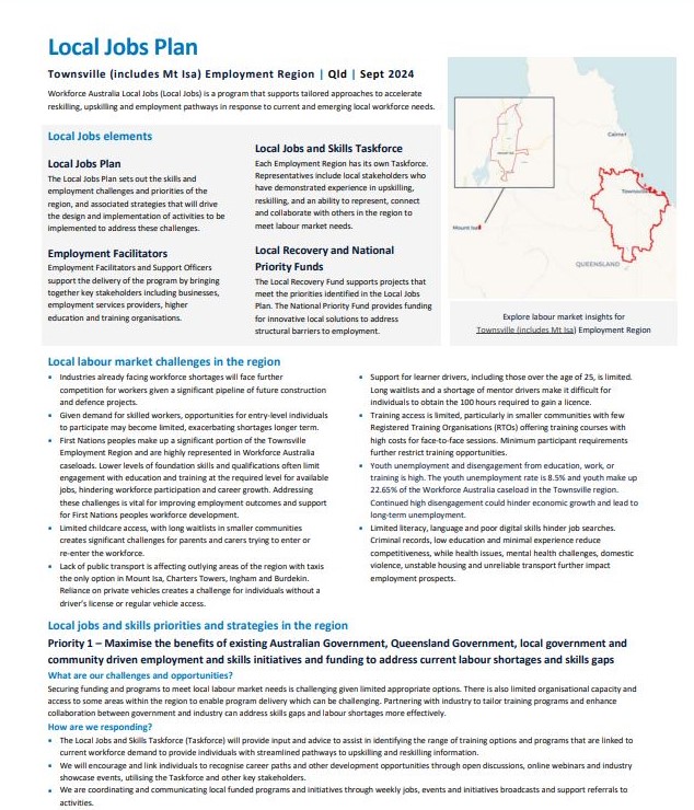 The Townsville (including Mt Isa) Local Jobs Plan outlines strategies to address workforce challenges and enhance employment opportunities in the region. Key priorities include leveraging government and community initiatives to fill current labor shortages, creating pathways into major and emerging industries, supporting skill development for Indigenous youth, facilitating apprenticeships and traineeships for young people, and promoting employment opportunities for mature-age job seekers. The plan emphasizes collaboration among local stakeholders to implement tailored solutions that meet the region's unique needs. Find our more about the Local Jobs Plan by vising the Department of Workplace and Relations |