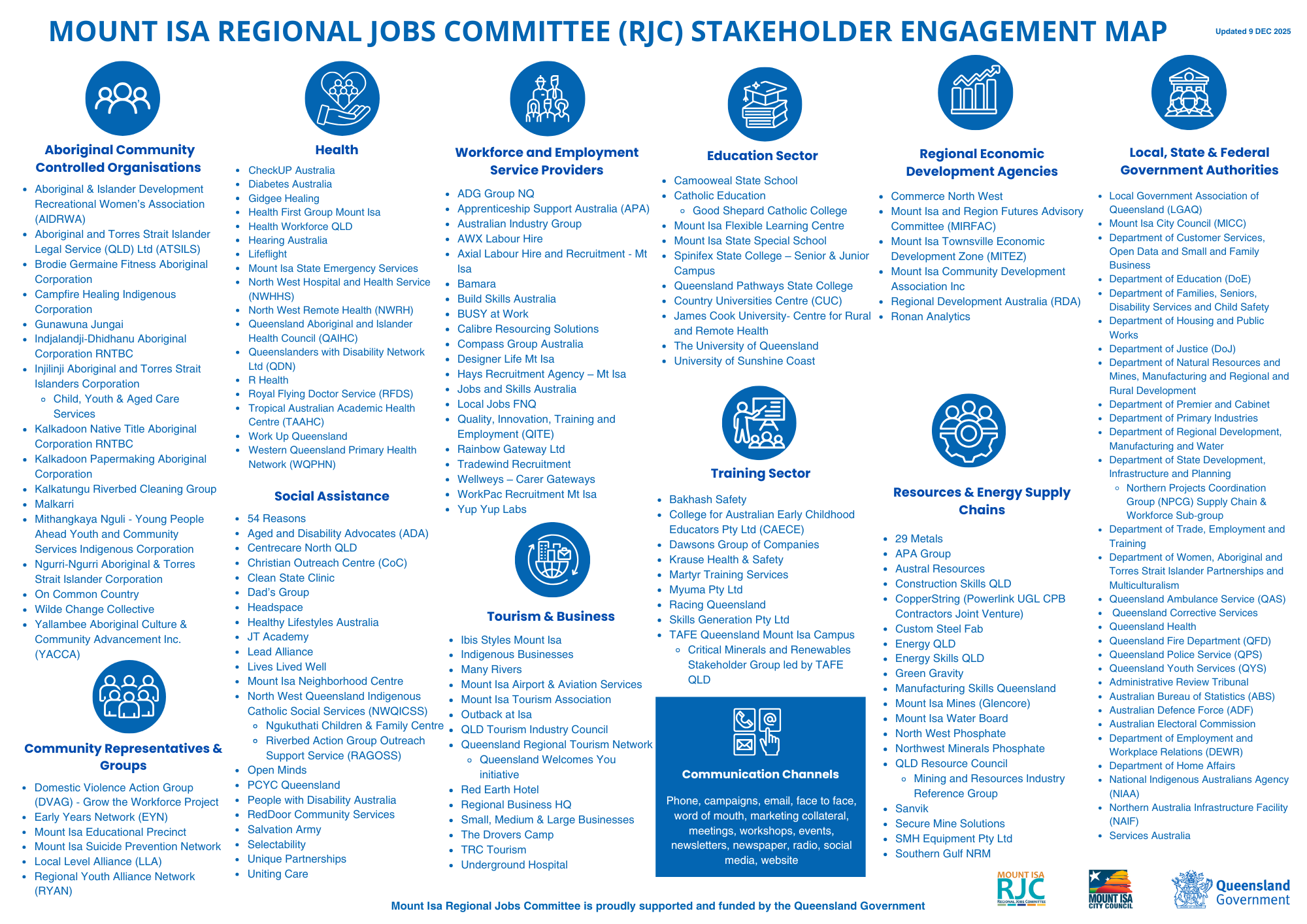 The Mount Isa Regional Jobs Committee (RJC) brings together a diverse network of stakeholders spanning community, community organisations, government at all levels, industry, education and training providers, employment services, economic development agencies, and the resources and energy sectors. This broad engagement ensures all voices are included—from grassroots health and social services to large-scale employers and infrastructure partners.