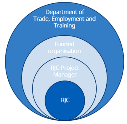 RJCs are to operate their own entity and against outcomes from community consultation. The Department has oversight for the RJC program and responsibility for administration of the program. The organisation funded to deliver the RJC project has responsibility for ownership and delivery of the Services Agreement, ensuring compliance with the Agreement and performance against project deliverables and miles tones. The RJC Project Manager is responsible for coordinating the project including meeting milestones and deliverables, on behalf of the funded organisation. | ![]() |